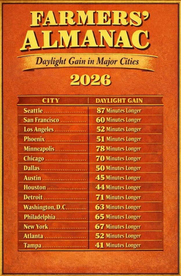 Here at the Farmers’ Almanac, we’re all about practical wisdom rooted in the stars and seasons. Daylight gain varies by latitude—the farther north you are, the more dramatic the increase, thanks to Earth’s tilt. We’ve crunched the numbers based on approximate calculations for each state’s capital city, rounded to the nearest latitude band. These figures represent the rough difference in daylight hours from the start to the end of February (think February 1 to March 1 for a full month’s gain). Keep in mind, exact amounts can shift slightly depending on your precise location, elevation, and even the year, but this gives a solid overview.