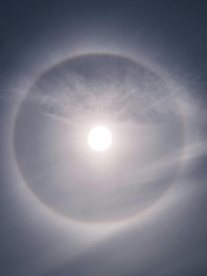 That ring is caused by ice crystals high in the atmosphere, often in cirrostratus clouds—clouds that frequently appear 12 to 48 hours before a storm system arrives.
